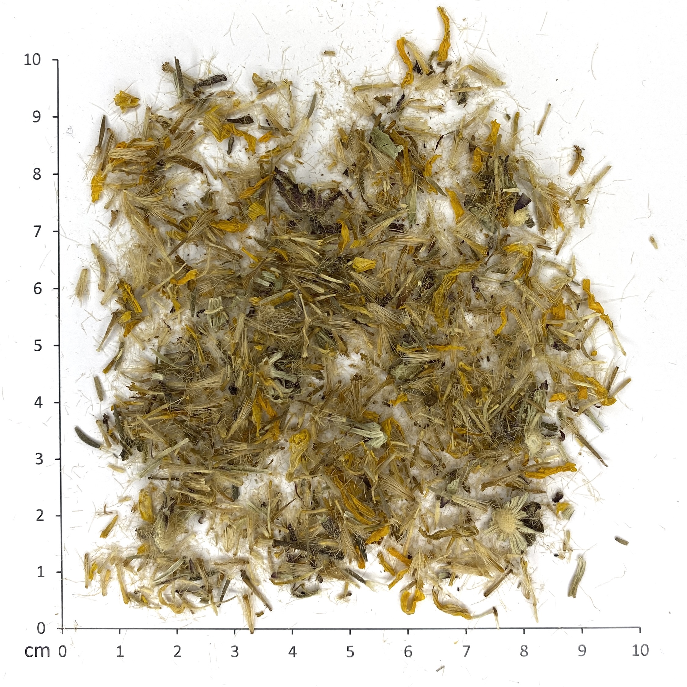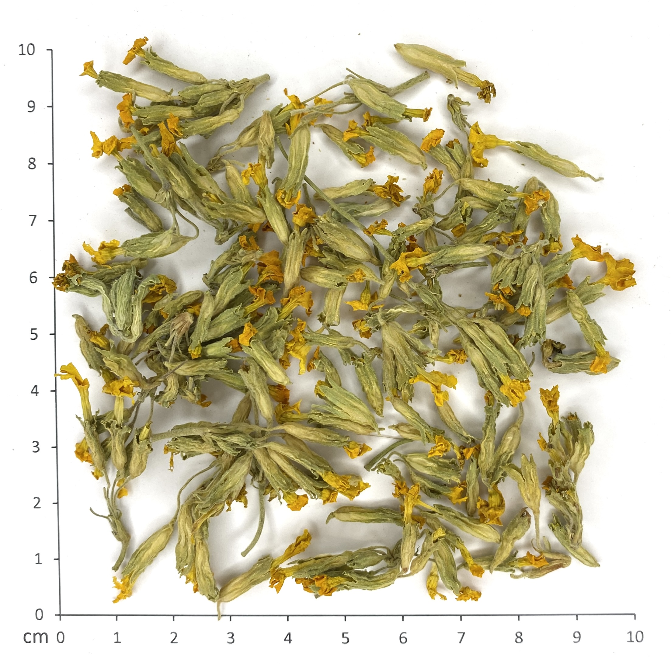 Die Schnittdroge besteht aus getrockneten, meist zerfallenen Blütenkörbchen oder auch aus einzelnen Röhrenblüten und stark geschrumpften, gold-gelben Zungenblüten. Charakteristisch sind auch die borstigen Pappushaare, die das grauweiße Aussehen der Schnittdroge bedingen.