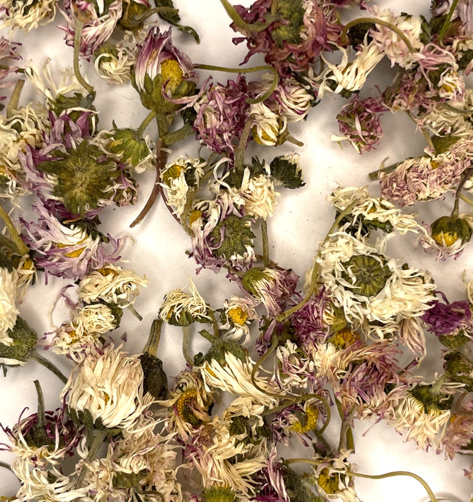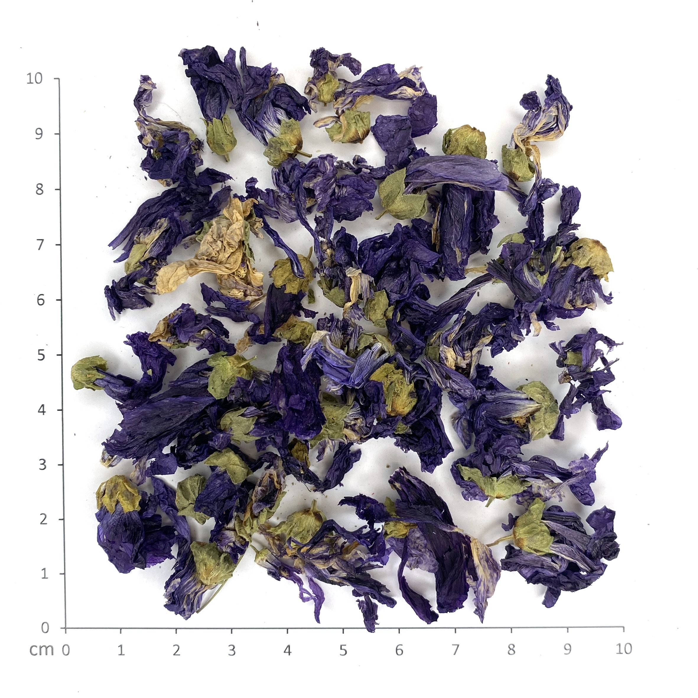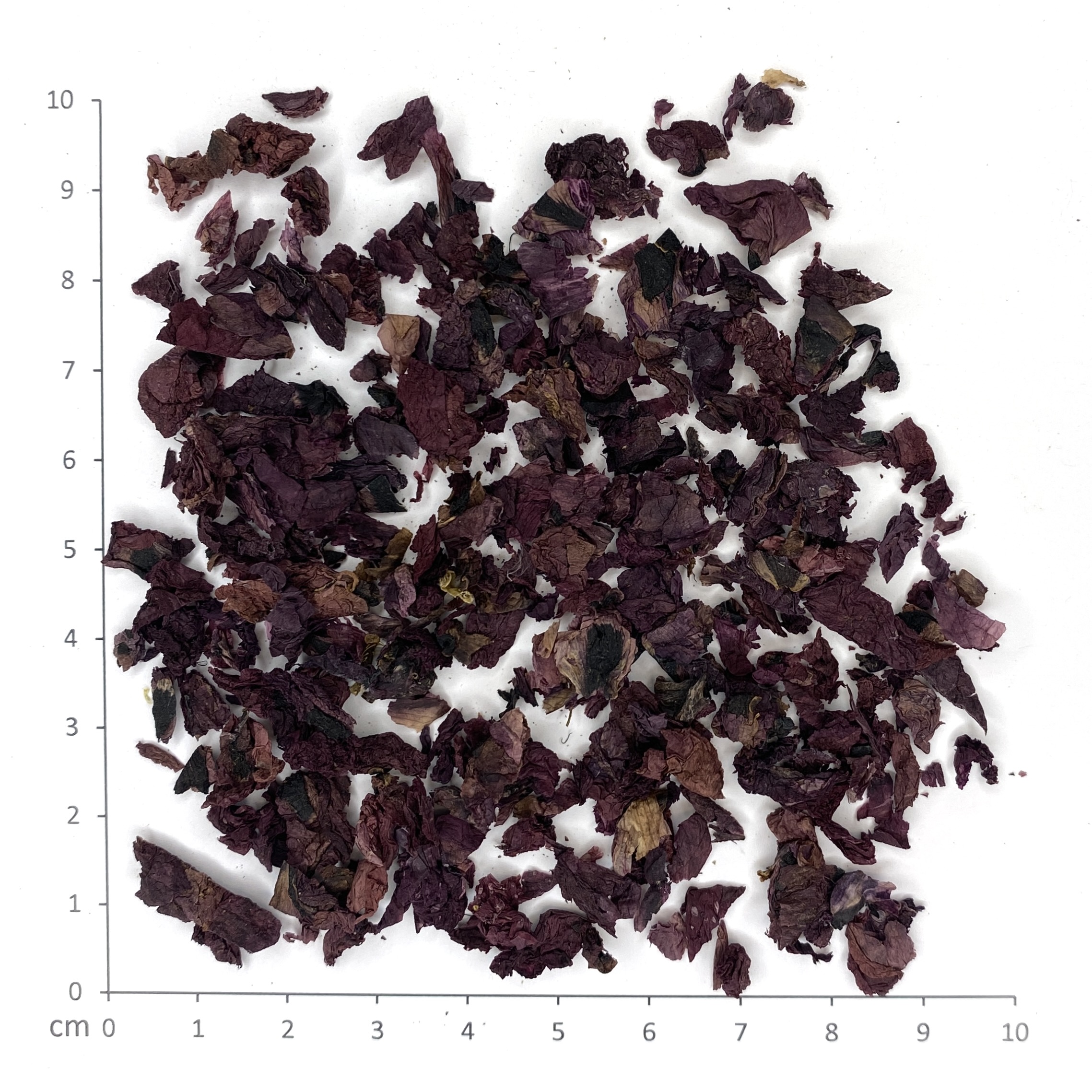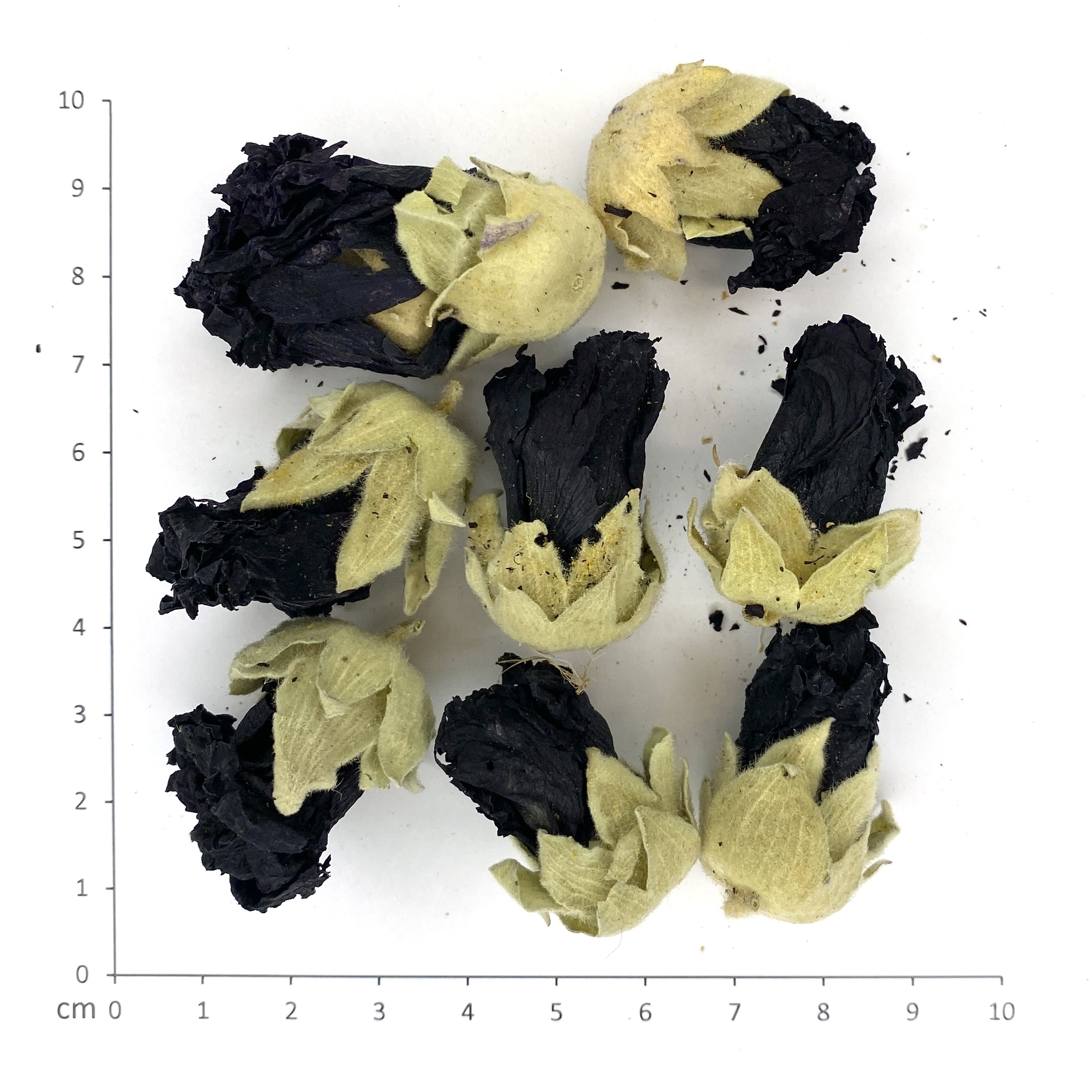 Die Kronblätter sind in der getrockneten Droge stark geschrumpft und die Farbe variiert von tiefblau-grau bis hin zu braun.