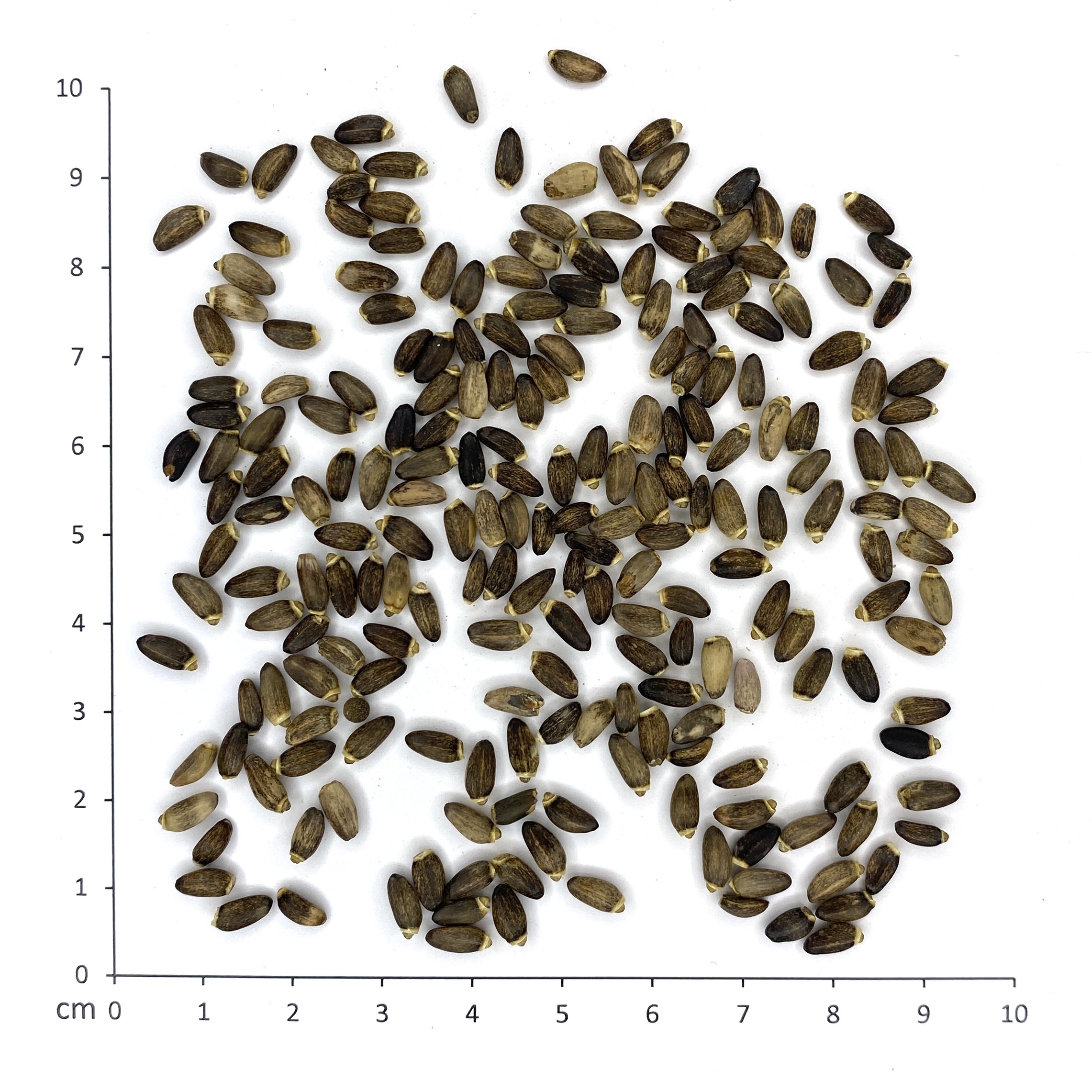 Länglich eiförmige Achänen mit glatter, glänzender beige bis dunkelbraun gescheckter bzw. gestreifter Oberfläche. Am oberen Ende befindet sich eine blassgelbe, vorspringende Ausstülpung, welche einen Kragen von etwa 1 mm und die Reste des Griffels bildet.