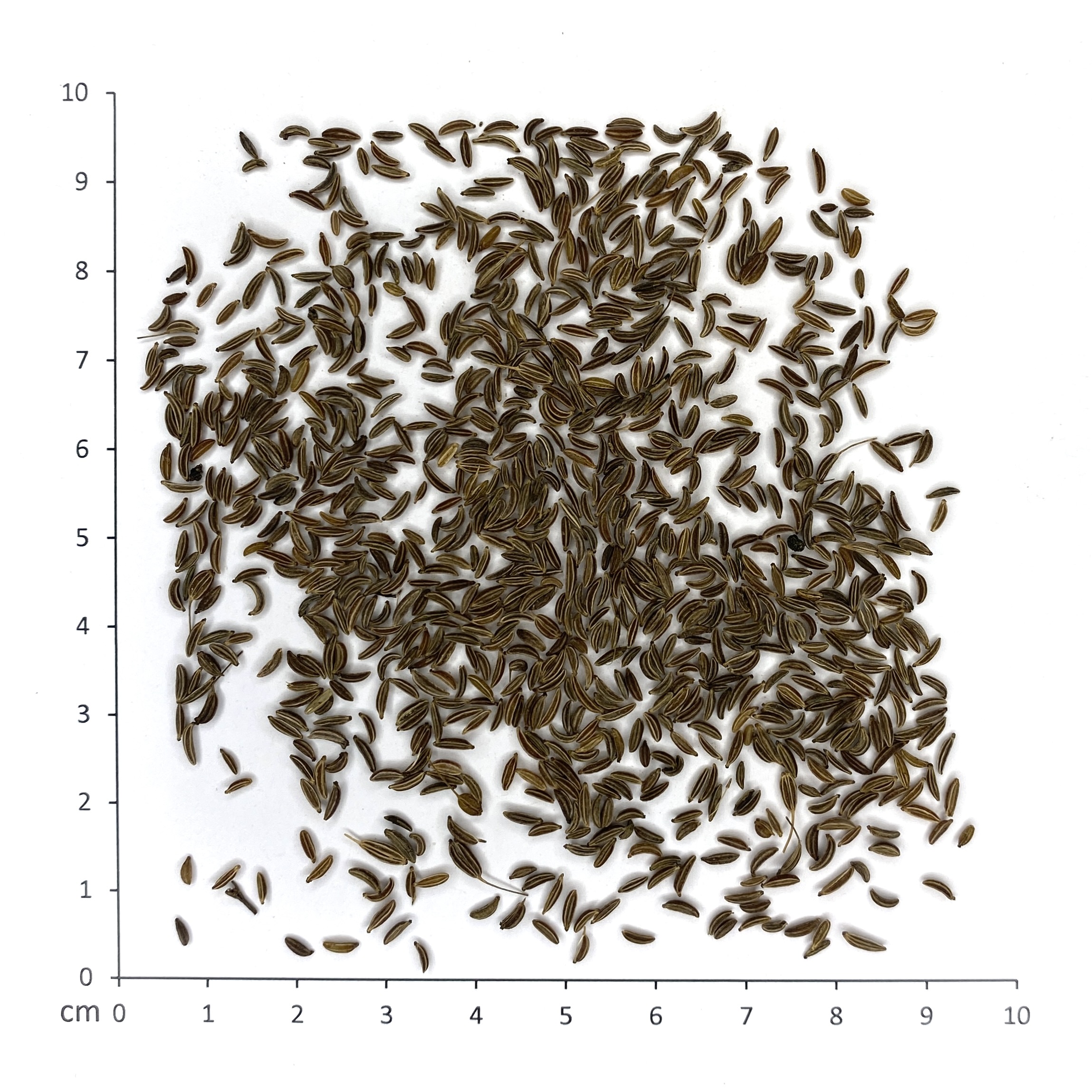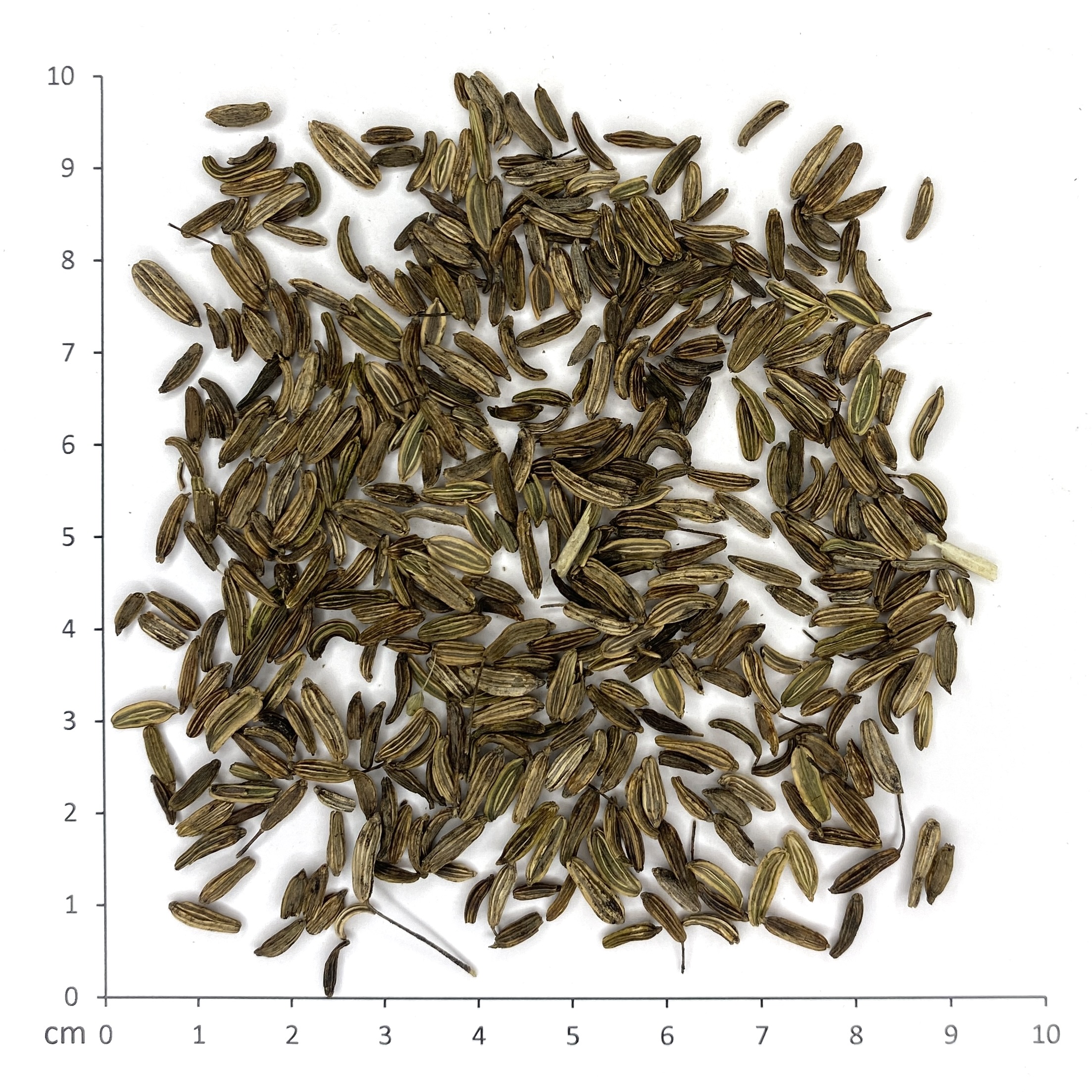Braune oder graubraune, meist einzeln vorliegende Teilfrüchte, sichelförmig gekrümmt und an beiden Enden zugespitzt mit 5 hervortretenden, hellen Rippen. Typischer Kümmelgeruch.