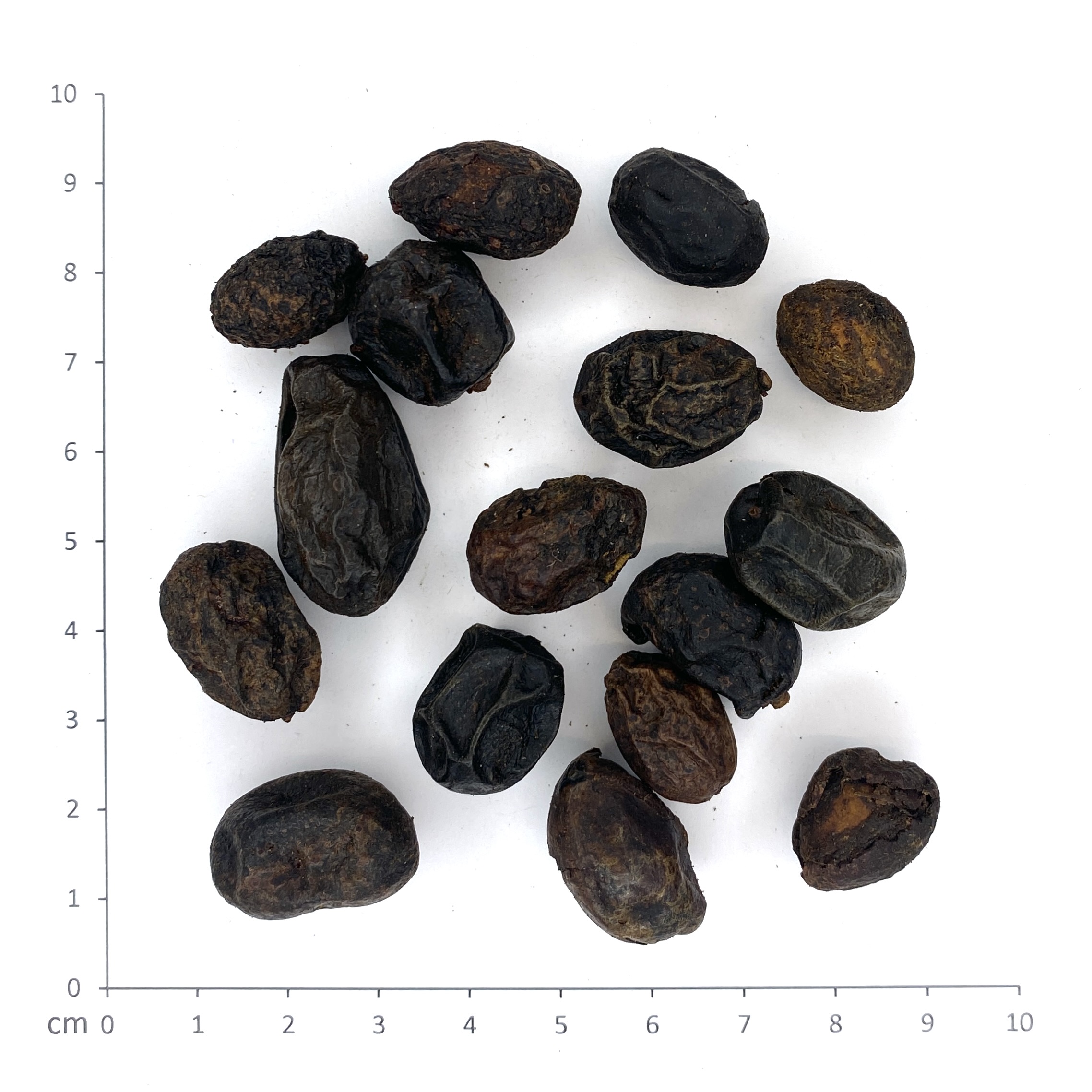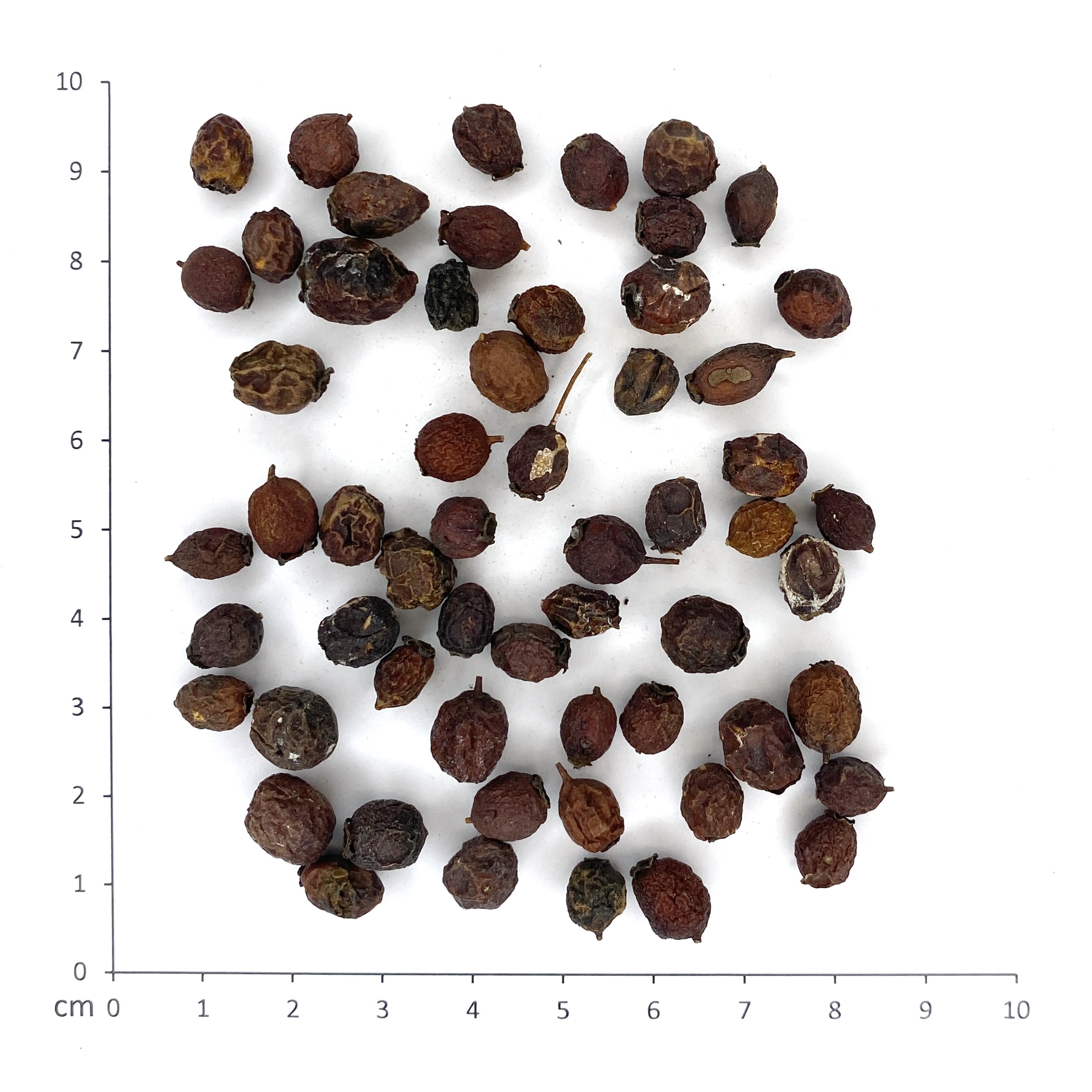 Schwarzbraune, kugelförmige, netzförmig gerunzelte Früchte mit einem Durchmesser von 3-6 mm. An der Basis oft noch eine Narbe vom Blütenstiel erkennbar sowie die Reste des Griffels an der Spitze. Das weiß-gelbliche Endokarp weist einen im Bruch ersichtlichen Hohlraum auf.