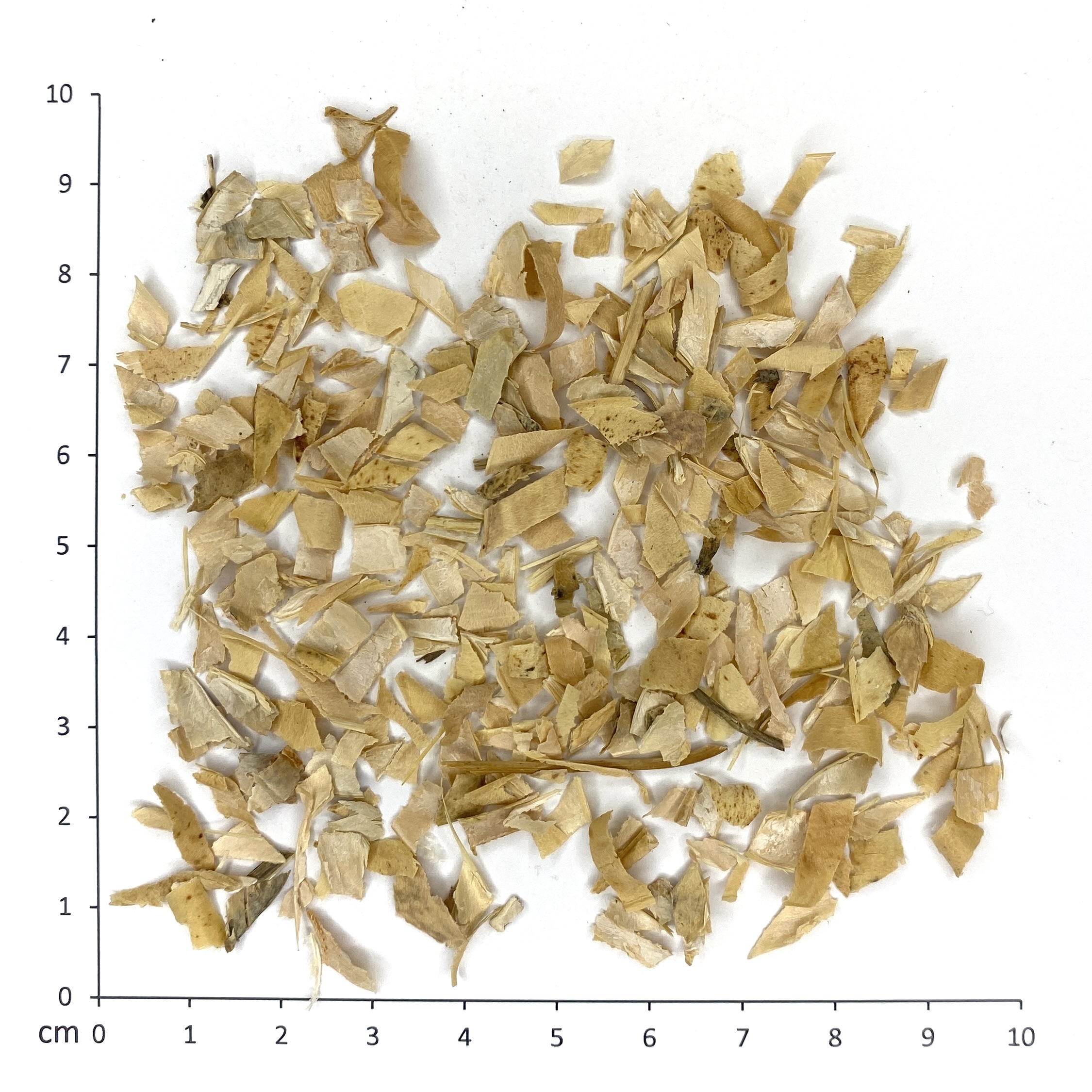 Von den Samen befreite Fruchtwände mit schwach gerunzelter, gelblicher Oberfläche. An der Innenseite befindet sich ein weißlich glänzendes Häutchen.