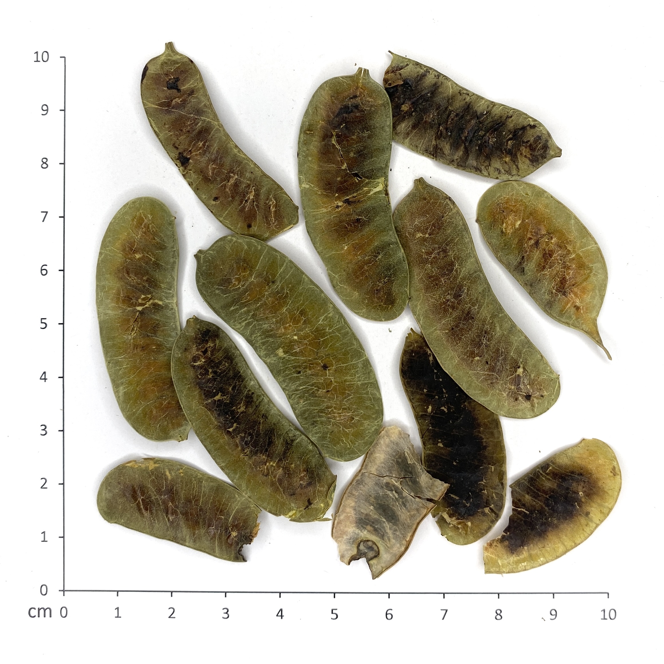 Grünlich-braune, an den Stellen, wo sich die Samen befinden, braun gefärbte, flache nierenförmige Hülsenfrüchte, mit einer Länge von 4-5 cm. Am Ende ist ein kurzer Stielansatz zu erkennen.