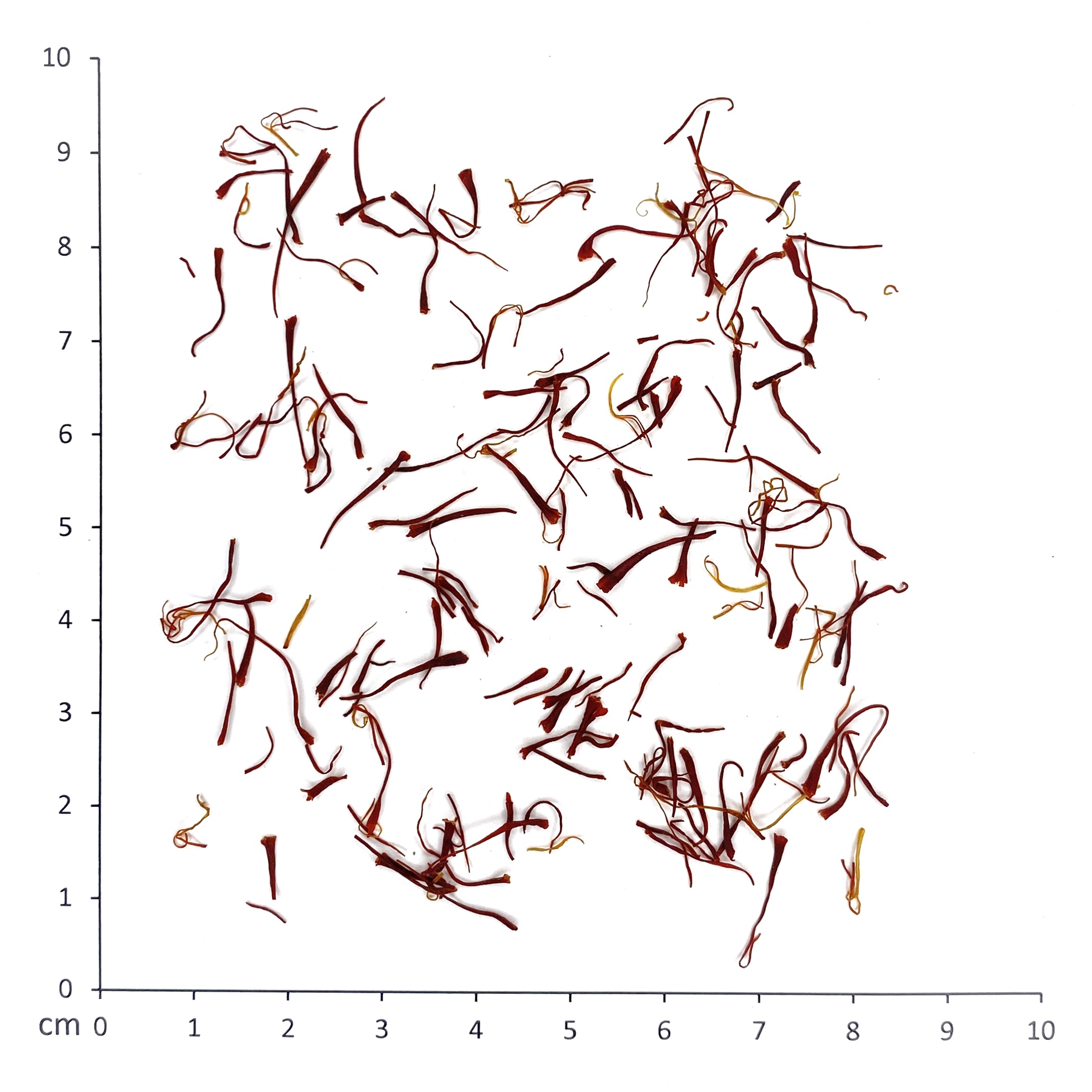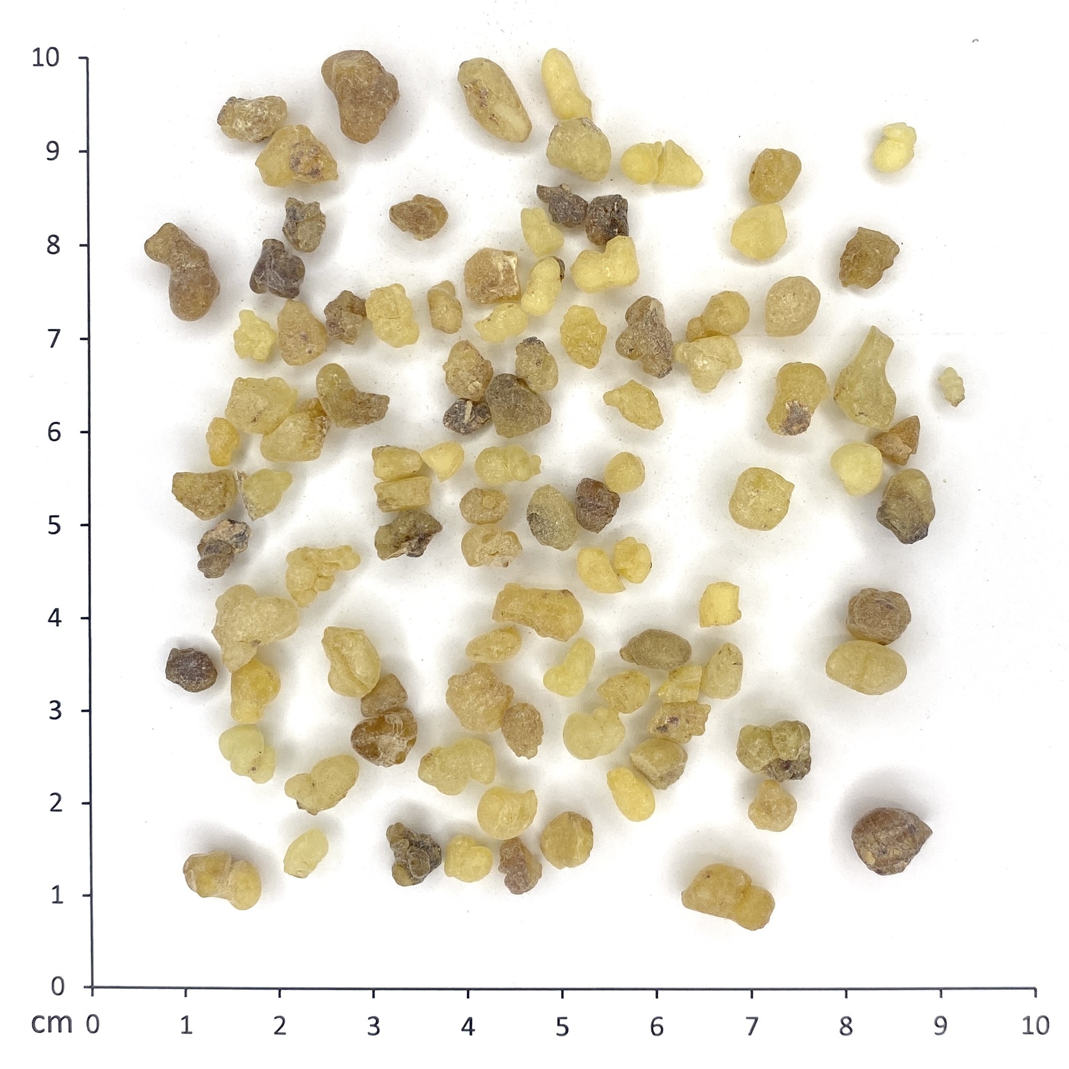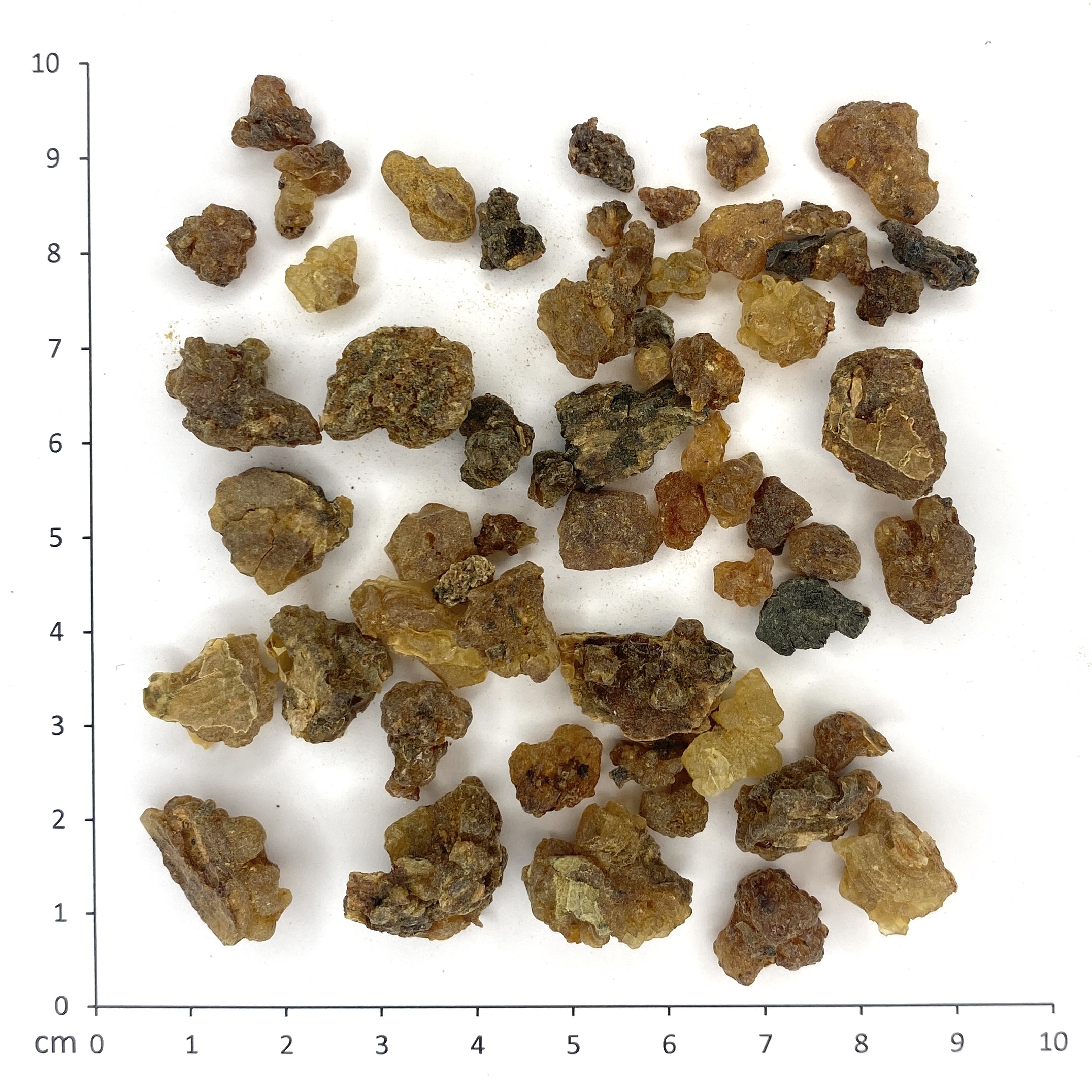 Hauptsächlich gelbe oder blass rötlich-braune, unregelmäßig geformte Körner aus luftgetrocknetem Gummiharz in unterschiedlicher Größe, dessen Oberfläche mit einem gräulichen Staub bedeckt ist.