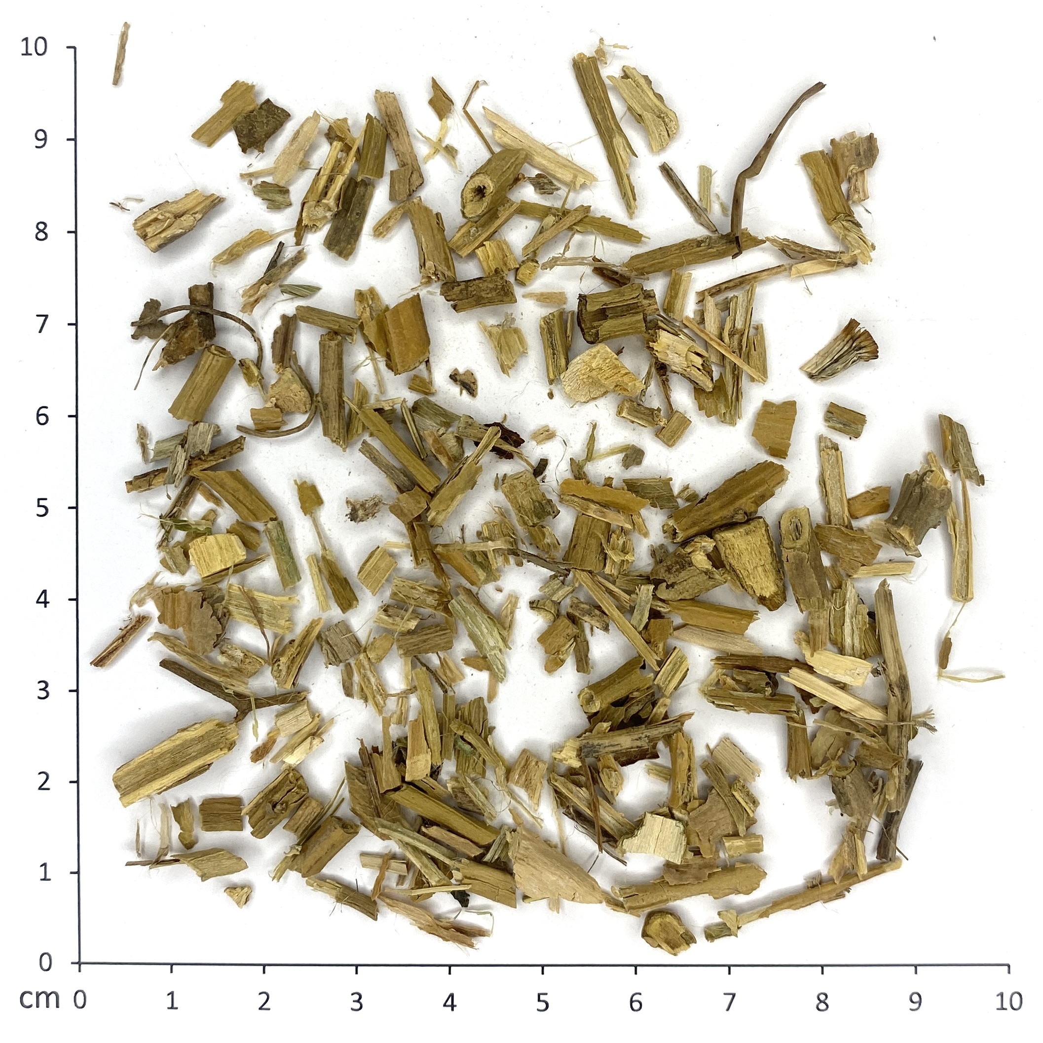 Hohle, zylindrische, gelblich oder graubraune Stängelstücke mit dünner Rinde, gelblichem Holzkörper sowie vereinzelt sichtbaren Blatt- und Zweignarben.